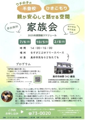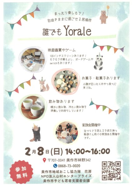 『家族会』2月開催のお知らせ イベント 2026.01.29 2月8日(日)14時~16時『家族会』を開催します。生きづらさを抱える子供を持つ親御さんのお悩み相談のほか、月2回水曜日限定で開催している『誰でもYorale』を『サンデーYorale』として同時開催します。100インチスクリーンで映画鑑賞やゲームをしたり、ボードゲームもできます。お一人でも親子でも自由な参加ができますよ。日曜日の午後をのんびりと過ごしませんか。お気軽にお立ち寄りください。 水曜日の『誰でもYorale』は、2月4日(水)、2月18日(水)です。