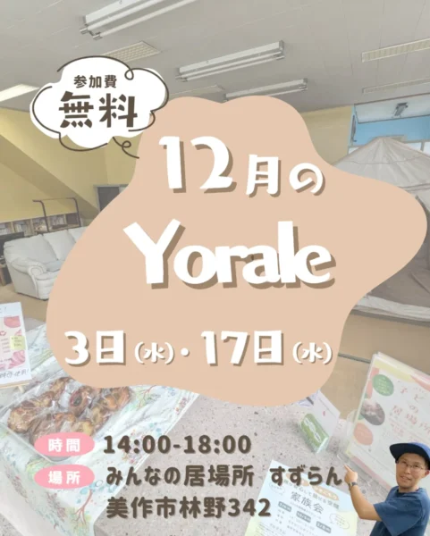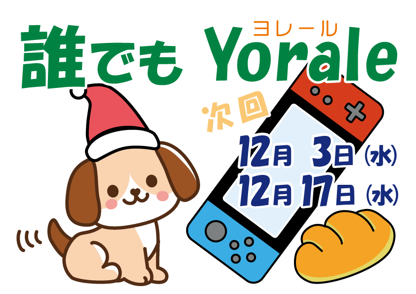 『誰でもYorale』12月開催 イベント 2025.12.012026.01.29 12月の『誰でもYorale』は、3日(水)、17日(水)14時~18時頃です。12月3日はパンの販売をお休みいたします。スクールドッグは両日とも来る予定です。お気軽にお立ち寄りください。