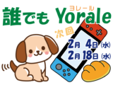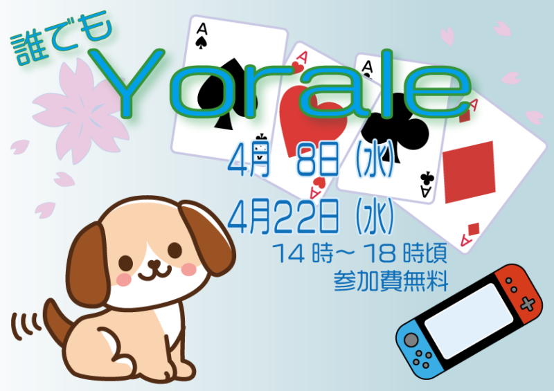 『誰でもYorale』4月開催 イベント 2026.03.302026.04.07 4月の『誰でもYorale』は、8日(水)、22日(水)14時~18時頃です。パンの出店は未定です。スクールドッグ(セラピー犬)は両日とも来る予定です。switchやボードゲームを用意しています。駄菓子の販売もありますのでお気軽にお越しください。 また、4月12日(日)14時~16時頃に『家族会』と同時開催の『サンデーYorale』もあります。お気軽にお越しください。