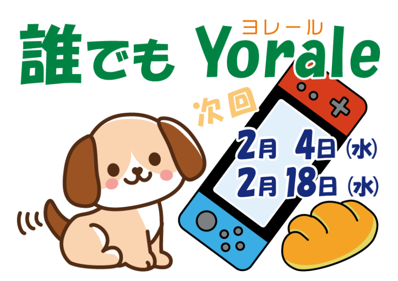 『誰でもYorale』2月開催 イベント 2026.01.29 2月の『誰でもYorale』は、4日(水)、18日(水)14時~18時頃です。スクールドッグ(セラピー犬)は両日とも来る予定です。パンの出店は未定です。また、2月8日(日)14時~16時頃に『家族会』と同時開催の『サンデーYorale』もあります。お気軽にお越しください。
